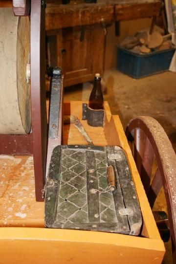 med smidda beslag mot ramen. Allt spikat med handsmidda spikar. Slipfundamentet testas och vevaxelns lager provas in. |