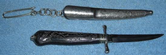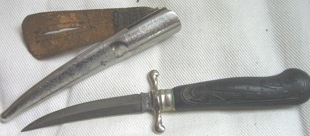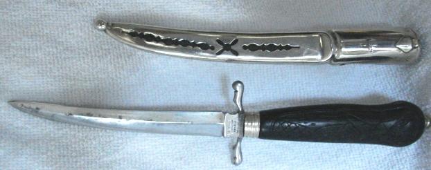 hög kvalitet. Kniven är totalt 288 mm. Kniven är en gåva från en dansk till en dansk, på holkbeslaget står: Til Einar Eriksen Fra Jens Simonsen 3-11-10 Kniven såldes för några år sedan på eBay, då bjöd jag för snålt, till min glädje kom den upp några år senare på Tradera, bara att slå till 1525 kr |