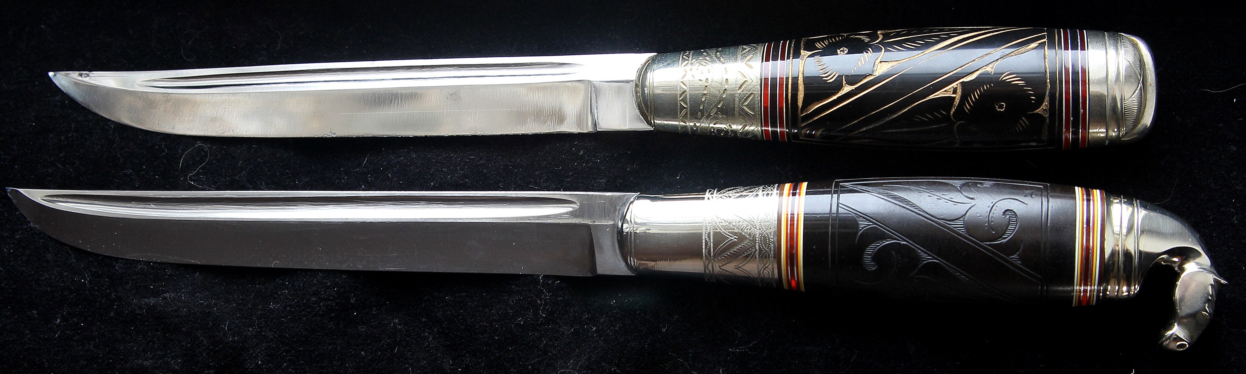 2014-03-20 Välkommen att beundra två knivar i absolut toppklass. Normalt samlar jag i huvudsak på ännu äldre knivar men de här uppvisar ett enastående gott hantverk, därför får de vara med och visa upp sig och även vara kvar i mitt lösöre. Kniven med kullrig skalle har Iisakki Järvenpää (IJ) tillverkat och den med hästskalle har Antti Mäenpänen (AM) tillverkat, bägge från Kauhava i Finska Österbotten. IJ-kniven mäter 29 cm och AM-kniven 32 cm, bägge i slidan. AM-kniven har etsat 1923 på slipfasen och min bedömning är att IJ-kniven är från samma årtionde eller möjligen 30-talet. Förutom det fina hantverket så är bägge knivarna med slidor i absolut toppskick, någon liten svag repa, annars mint.
