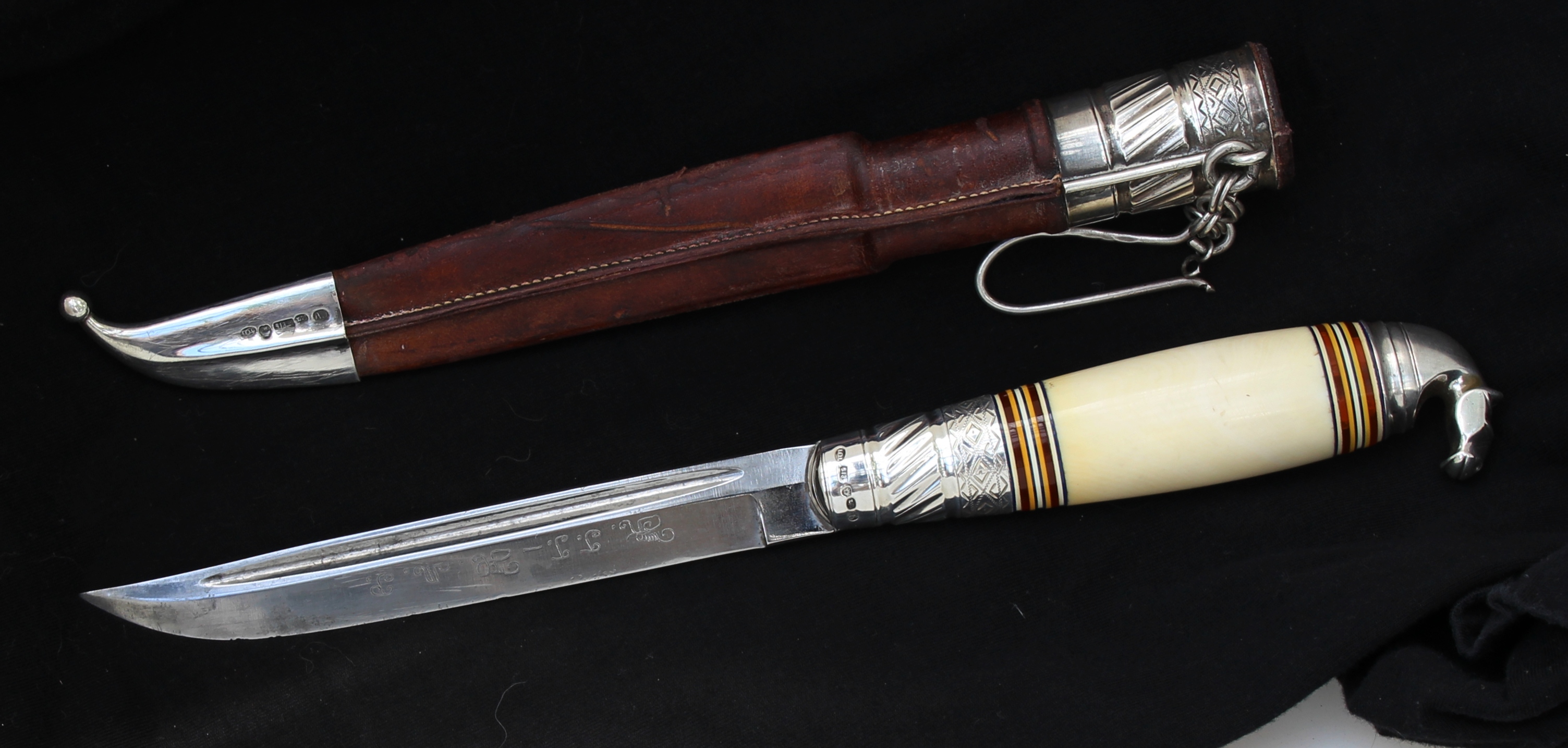 I katalogen kan man under rubriken: Knives of luxury, läsa att de är en av de finaste modellerna av Kauhava-knivar. Skaftet är av vit elfenben (ivory) och beslagen av äkta silver, 813. Knivarna finns med bladlängderna 10, 12 och 15 cm. Den kniv jag nu visar är 31 cm lång, bladet är 15 cm. Kniven kom jag över via nätet och köpte den i tron att det var en ovanligt fin nysilverkniv med skaft av galalit. Kniven som är tillverkad år 1930 är i mycket bra skick, du ser detta av bilderna nedan. Samtliga beslag är av stämplat silver, det är fem stämplar. Skaftet är av tand eller bete vilket syns på växtringarna. Ristinen skriver om detta och han har intervjuat döttrarna till Lahdensuo som angav elfenben. Bladet är vackert etsat och i mycket bra skick, några små nagg finns på eggen. Gravyren på denna kniv är mer omfattande än den som visas i katalogerna och beslagen är längre. Om detta beror på att katalogen tryckes innan eller om kunden haft speciella önskemål får vi kanske aldrig veta? I stämpeln står det: I.O.L "en krona" 813H L(A) A.6 IOL är silversmedens signatur och står för Oskari Laakso Kronan,